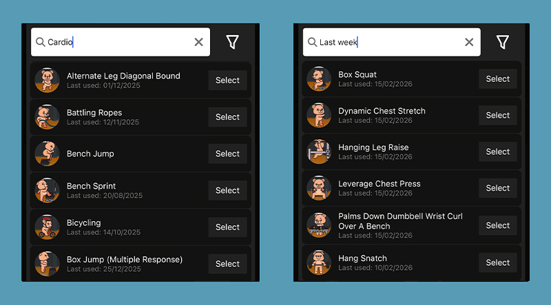 I also took it a step further and experiment with some basic natural language searching like "arms", "recent", or "cardio".